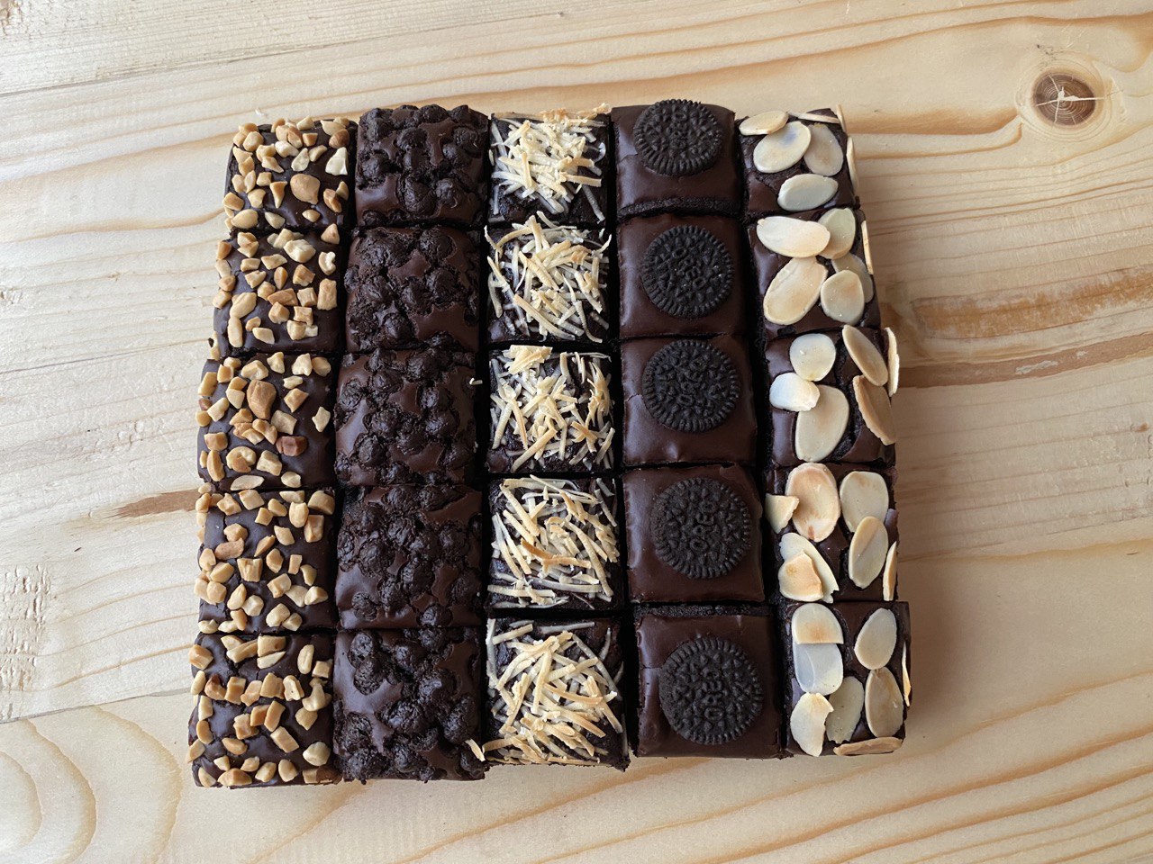 Fudgy brownies dengan 3 varian topping oreo, almond, dan kacang. Cocok banget dimakan bareng teman - teman ๐๐